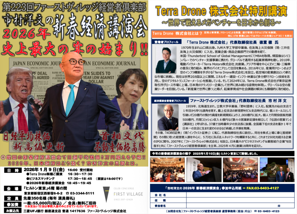 2026年度、最初の経営者倶楽部でもございます新春経済講演会はTerra Drone株式会社徳重社長をお招きして特別講演を行います。